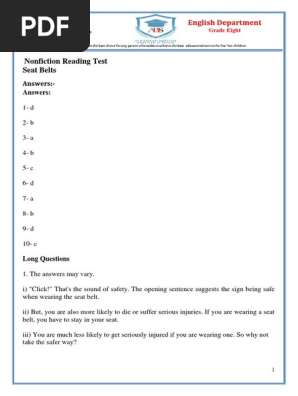 Nonfiction Reading Test Seat Belts Answers- Answers. The opening sentence suggests the sign being safe when wearing the seat belt. Read the following passage and answer the questions that follow.